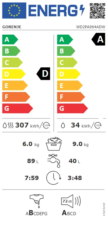 | Energoefektivitātes klase (Mazgāšana + Žāvēšana) | D |